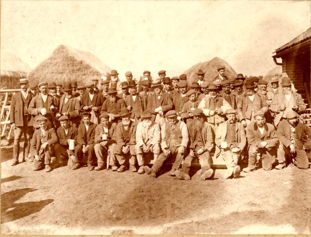 For centuries residents of Blunts Hall were tenant farmers until the late nineteenth century when Charles Hedley Strutt, son of the 2nd Baron Lord Rayleigh of Terling, became the owner and continued farming the land. In this photograph dated 1906, he is seen in the centre of the group of Blunts Hall farmworkers, probably taken at harvest time.