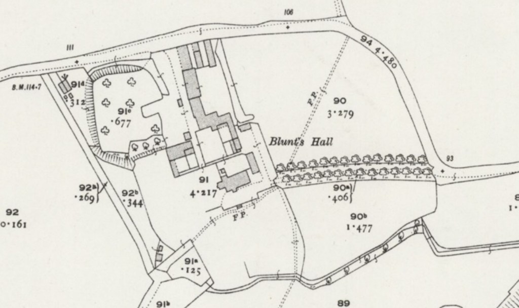 The original structure dates to 1230, with 17th, 18th, and 19th century additions. Blunts Hall Ringwork, within the grounds of the Hall, is a scheduled Ancient Monument. Archeological excavations undertaken in 1958 and documentary evidence suggest the ringwork was constructed in 1141, as a site for an adulterine castle (baronial castle erected without a royal charter, commonly during the ‘anarchy’ of Stephen’s reign). It was abandoned during the reign of Henry II.